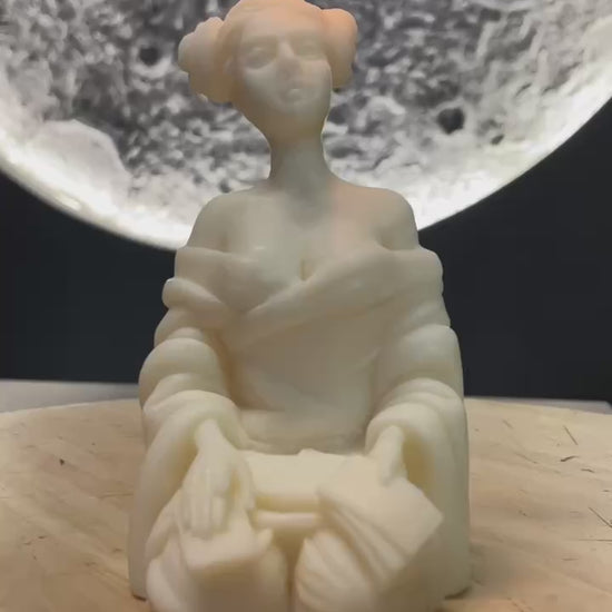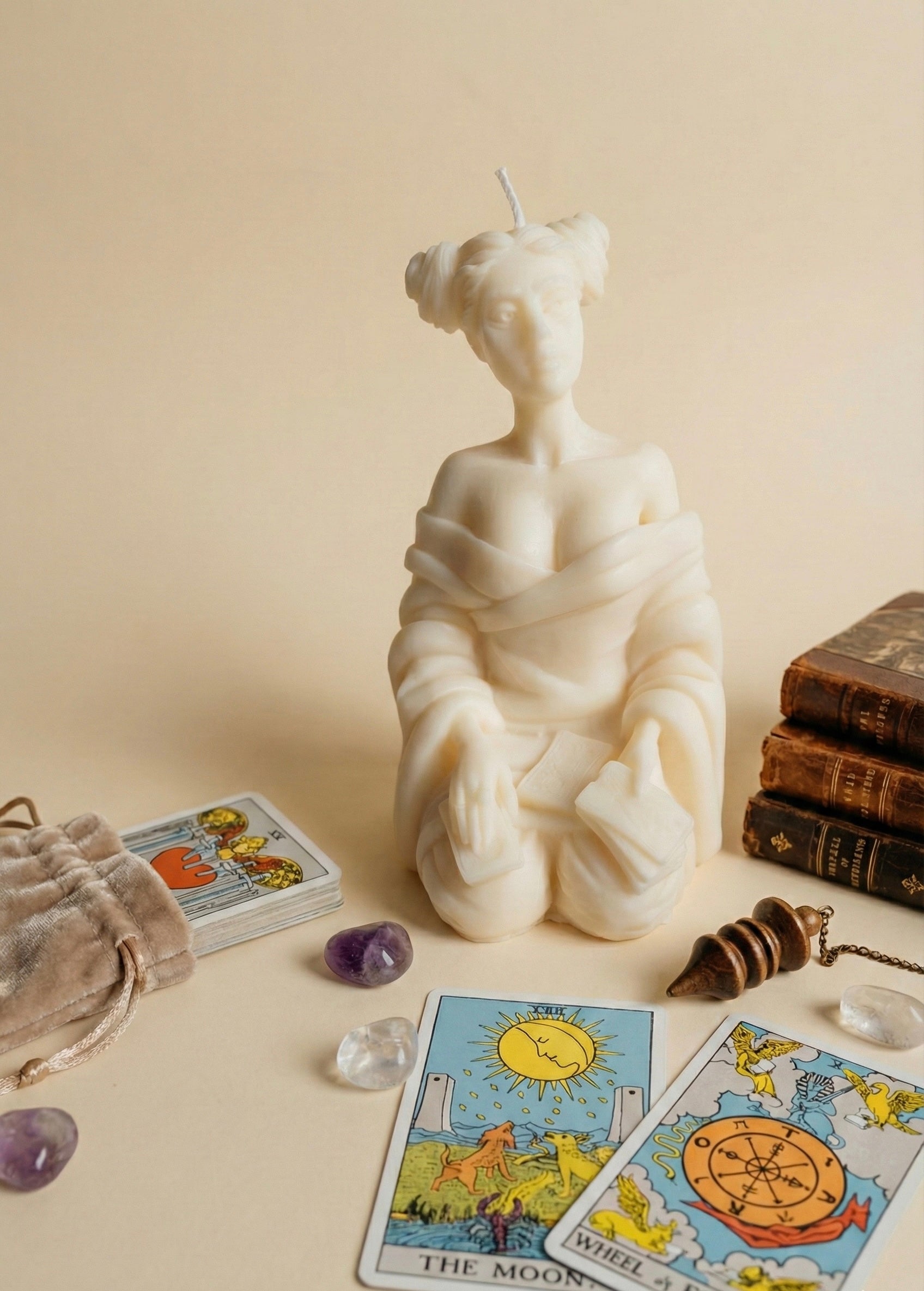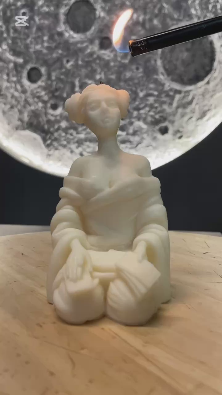🔮 This unique handmade candle is crafted from natural soy wax in the form of a tarot reader. Wrapped in an elegant shawl, she holds Tarot cards, symbolizing wisdom and divination.